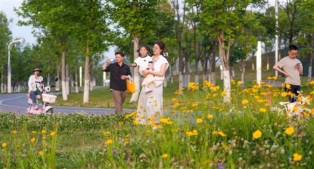 红杉林扮靓三合湖。市民漫步。公园美景如画。红杉林步道。近日,在三合湖湿地公园,红杉林一侧的步道宛如一条梦幻的丝带。市民们踱步其上,脚步轻盈,仿佛与这片红杉林共舞。微风轻拂,带来大自然的清新气息,让漫步