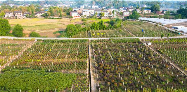 (整齐排列的苗圃。)(工人管护苗圃。)(苗圃基地与民房相映成景。)(苗圃基地与民房相映成景。)(基地一角。)10月14日,垫江县新民镇明月村苗圃基地,工人正在地里管护苗圃。据了解,该村共有苗圃100余亩,以