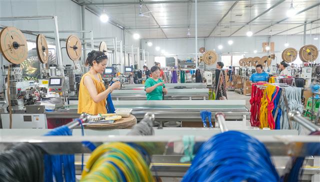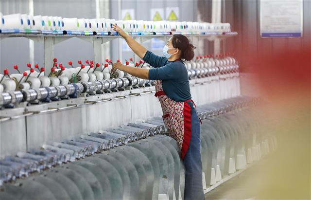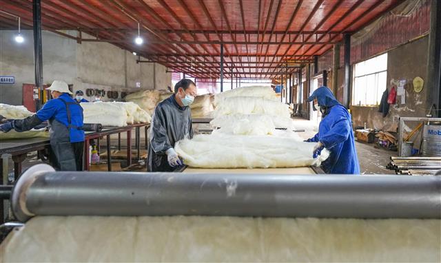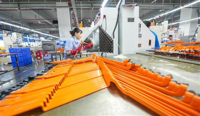 (工人正在作业。)(工人转运材料。)(工人在智能化流水线作业。)(工人在交流看生产线。)(忙碌的生产车间。)(工人在流水线上作业。)10月6日,垫江高新区重庆财衡复合材料有限公司,为顺利交付出口至欧美的