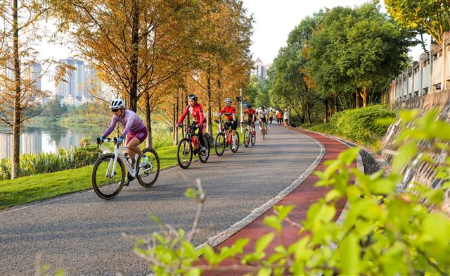 (市民骑行在公园里。)(骑行爱好者的身影与公园相映成趣。)(迎着晨曦骑行。)近日,牡丹湖湿地公园,迎着晨曦,一群骑行爱好者穿行在红杉林下,呈现出一幅宜居宜游的城市生态画卷。近年来,我县按照市民健身需求