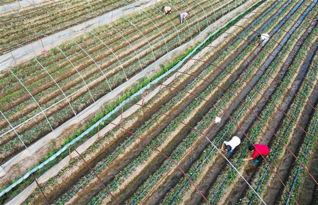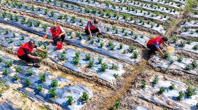 (移栽草莓苗。)(管理草莓苗。)(管理草莓苗。)眼下,正值秋播秋种时节。9月23日,在太平镇永茂村草莓基地,工人正抓紧时间移栽草莓苗,以确保草莓能按时上市。据了解,该基地共有20余个大棚,利用大棚控温和滴