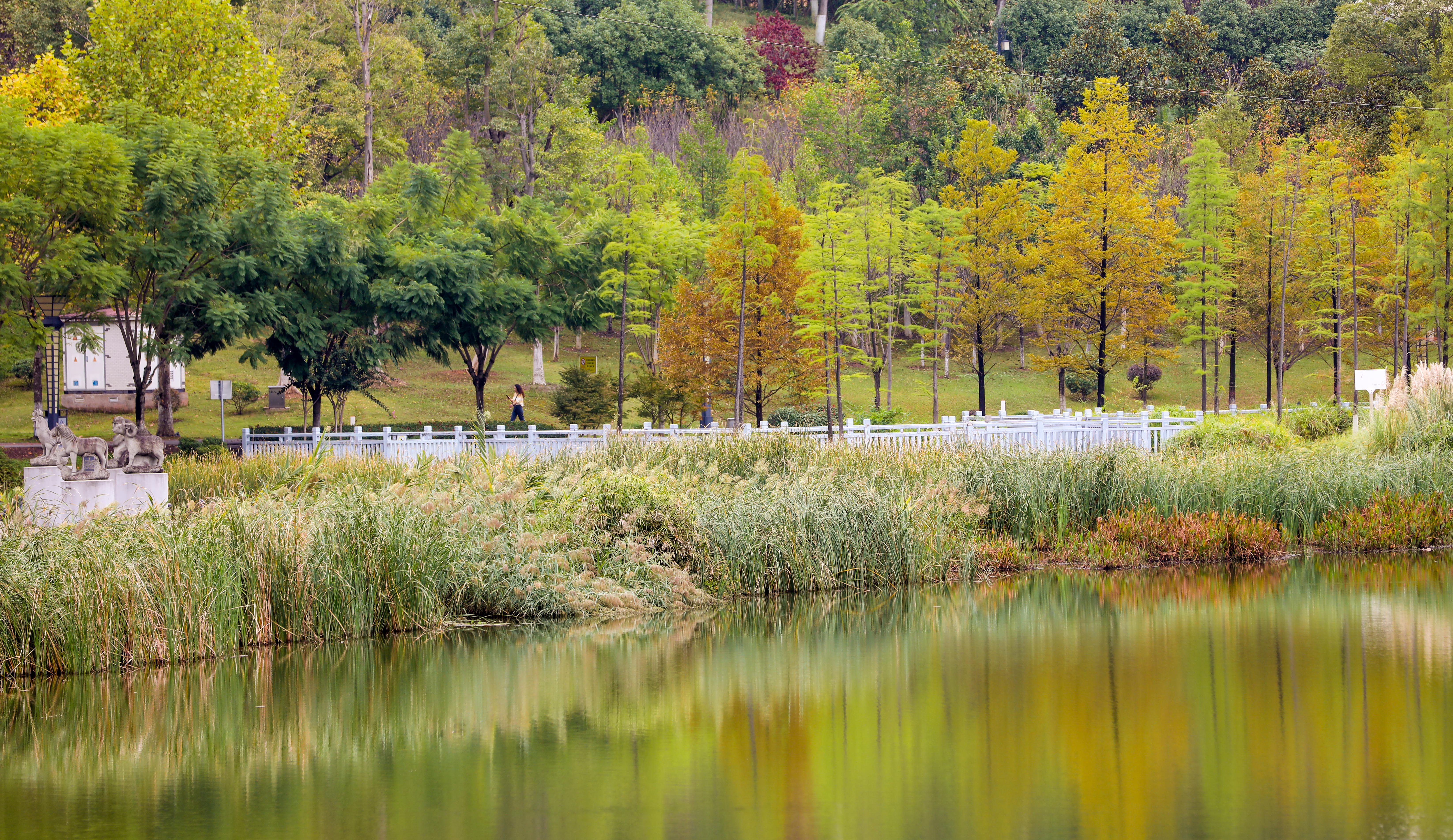 (湖面如镜,秋色宜人。)(市民迎着秋风悠闲骑行。)(市民在公园散步。)10月18日,牡丹湖湿地公园的树木已经披上彩色的外衣,彩林倒映在清澈的湖水中,宛若仙境。市民趁着秋日晴好天气在公园跑步、骑行、休憩,畅