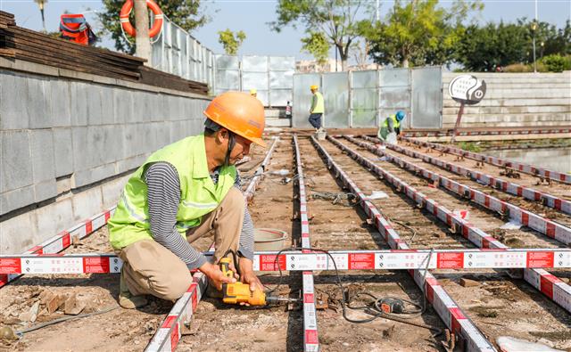 (工人在施工。)(工人在重新打地板基础。)(公园一侧工人在抓紧施工。)10月29日,在文笔湖湿地公园,工人加紧整改公园木质地板步道。据了解,本次公园整改包含整个环湖步道,预计工期一个月,下月底便可完工投用