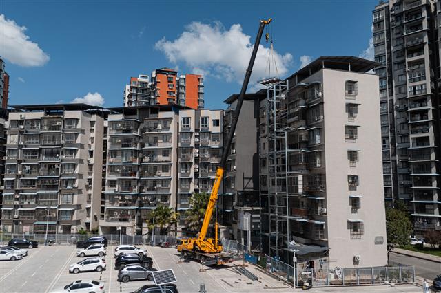 (工人固定材料。)(工人在钢架结构间娴熟作业。)(吊车运输材料。)(吊车运输材料。)近日,佳华雅苑3期老旧小区加装电梯工程紧锣密鼓推进。近年来,我县以老旧小区改造为契机,聚焦居民 “上下楼难” 的痛点,