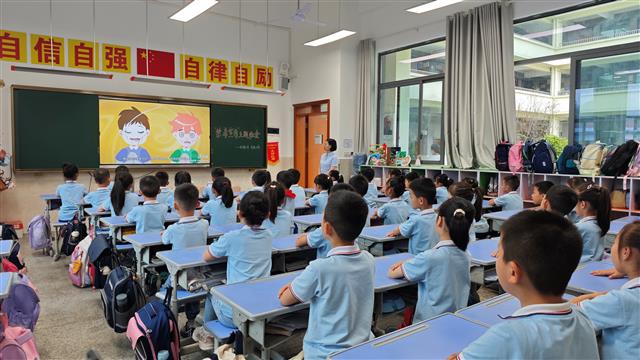 6月19日,西湖小学校开展禁毒宣传主题班会,预防校园毒品犯罪,营造安全、文明、健康的学习气氛。学生集中观看禁毒宣传片。记者 王喜 摄主题班会上,老师组织学生集中观看了《毒品小魔大变身》禁毒宣传视频,用生动