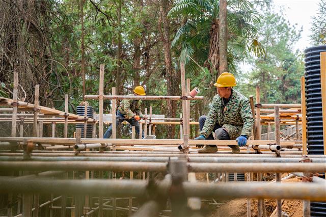 3月1日,记者从县明月办获悉,金桂果园露营基地已完成车行道和露营平台的基础梁柱浇筑工作,整个工程预计4月中旬完工投用。工人正在搭脚手架。记者 魏瑞 摄记者来到施工现场,只见露营基地已初具雏形,工人们正有条