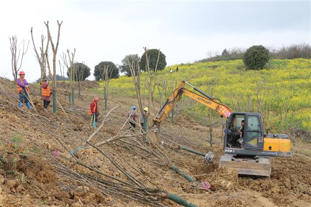 近日,在天香路沙坪段落日乌托邦露营基地处,工人们正忙着修剪枝丫、栽种树木、回填泥土,现场一派忙碌景象。工人正忙着修剪枝丫。据了解,此次移栽的树木为成渝地区双城经济圈重庆明月山国土绿化试点示范项目垫江县