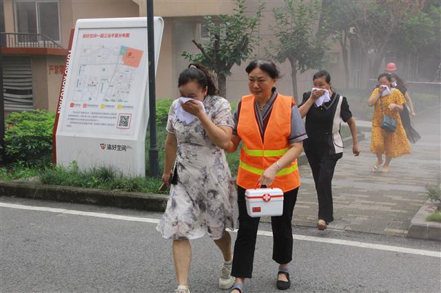 6月19日,县消防救援局与重庆丹源安保服务有限公司在松林小区联合开展消防安全应急演练,增强企业员工、居民的消防安全意识,提升应对火灾等突发事件的自救互救能力。(演练现场。记者 何明燕 摄)“大家不要慌,快