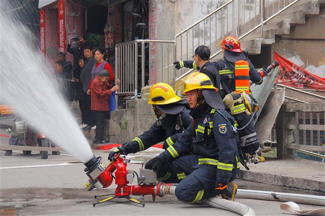 10月24日,县消防救援局联合县公安局、县应急管理局等部门在桂东批发市场开展消防演练,进一步提高市场管理工作人员及商户消防安全意识,提升应急消防安全处置能力,共筑平安“防火”墙。(应急队员铺设水带。记者
