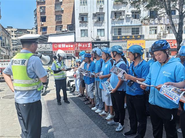 8月19日,县公安局交巡警大队民警来到西欧步行街饿了么配送站点开展交通安全宣传,并为外卖骑手们发放防暑降温药品。(活动现场。谭彬 摄)活动现场,民警结合外卖行业工作特性与当前道路安全形势,通过发放交通安全
