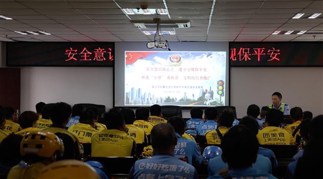 近日,县交巡警大队组织民警对我县美团、饿了么外卖100余名“骑手”进行交通安全教育培训,筑牢骑手的交通安全思想防线,遏制道路交通安全事故的发生。(培训现场图。记者 李双江 摄)活动现场,民警结合辖区外卖员