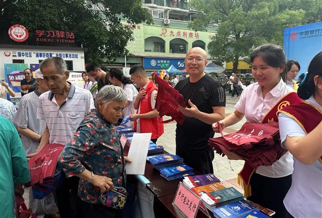 6月14日,垫江县打非办、国家金融监督管理总局垫江监管支局、垫江县公安局等多部门在中心广场联合开展防范非法集资宣传活动。活动现场,宣讲人员正在给市民发放宣传资料。记者 郁力 摄活动现场,宣讲人员向往来群众