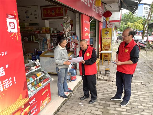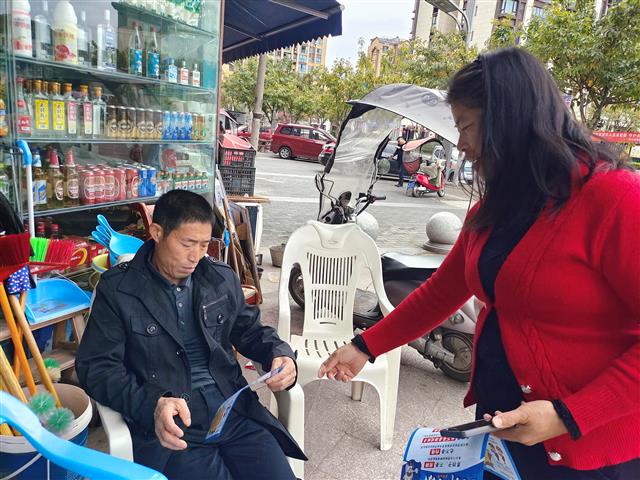 4月30日,杠家镇开展反诈防骗宣传活动,营造全民反诈的浓厚氛围。工作人员向商户业主讲解反诈知识。记者 谭彬 摄当天,工作人员深入辖区沿街商铺、饭店、书店等经营场所,通过发放宣传材料、张贴宣传海报等方式,用
