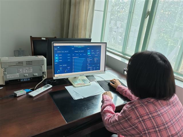 (县生态环境局工作人员查看智慧监管平台,线上督导企业整改。资料图)