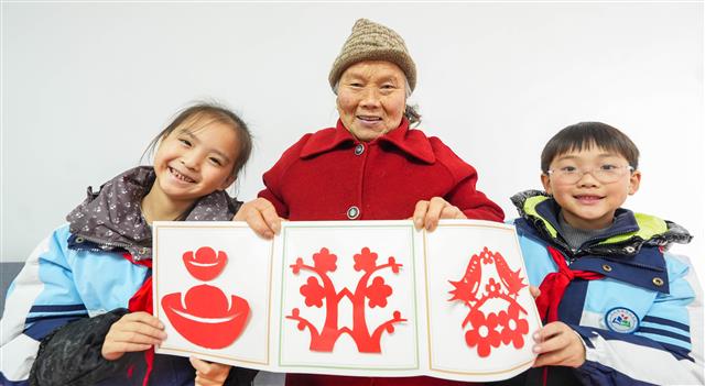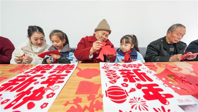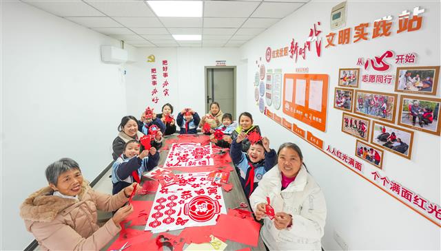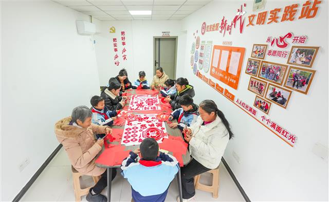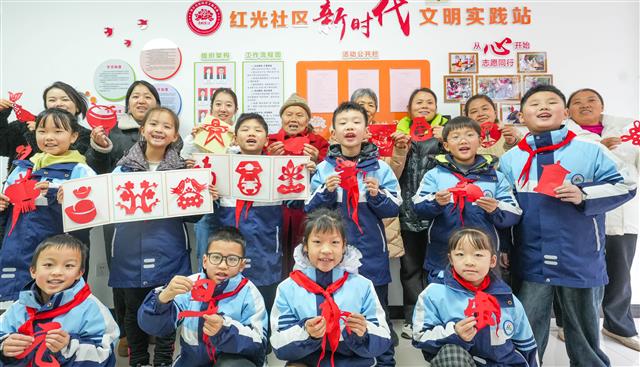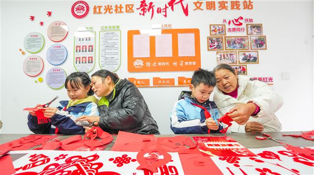 12月26日,桂北小学校组织学生、家长在桂溪街道红光社区新时代文明实践站和社区老人一起开展剪纸活动,迎接元旦节。