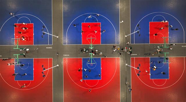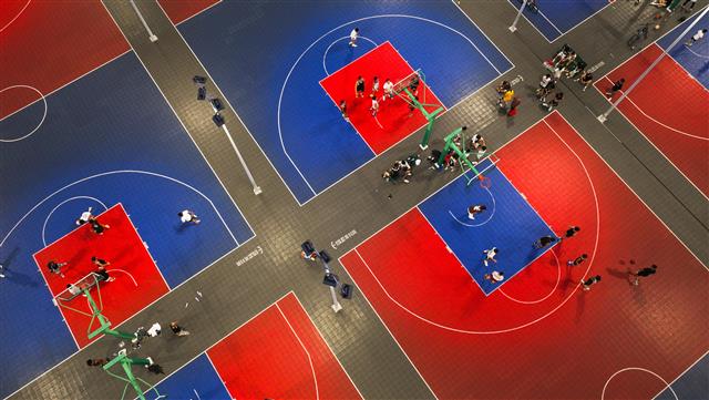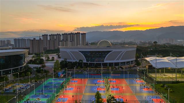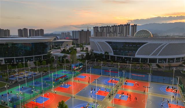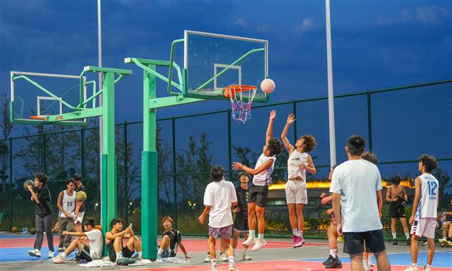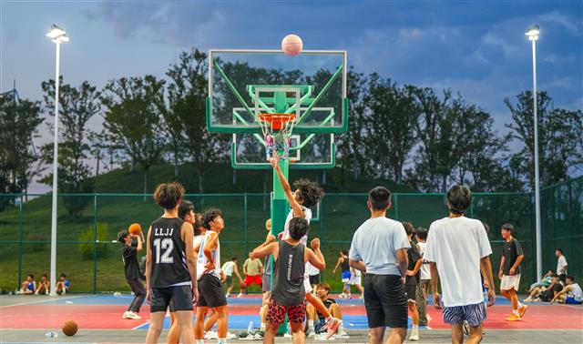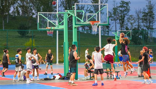 8月25日,三合湖湿地公园篮球场上,不少市民在打球,享受运动快乐。