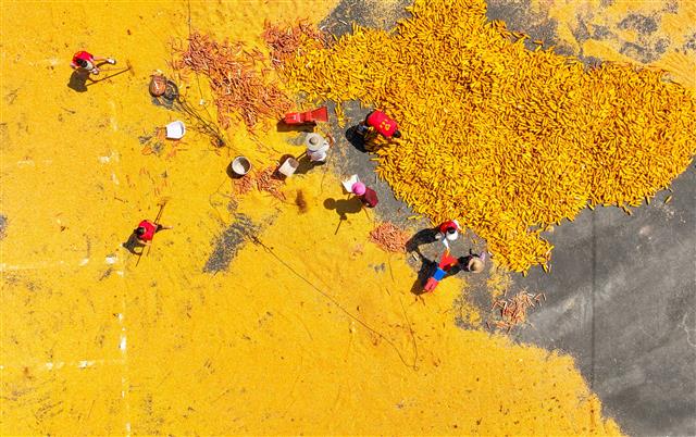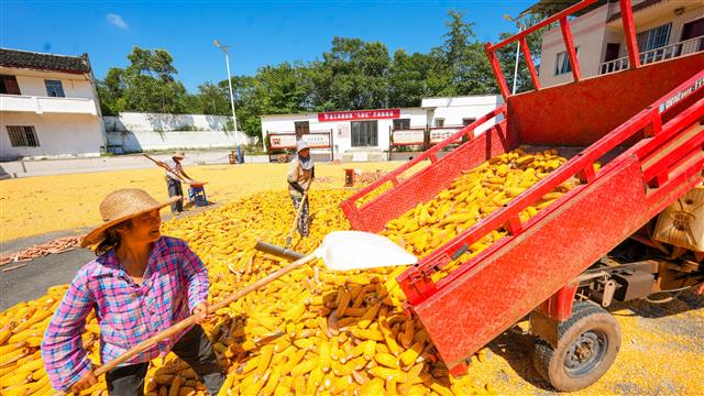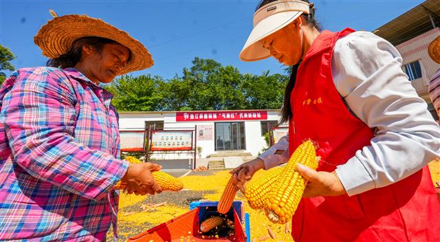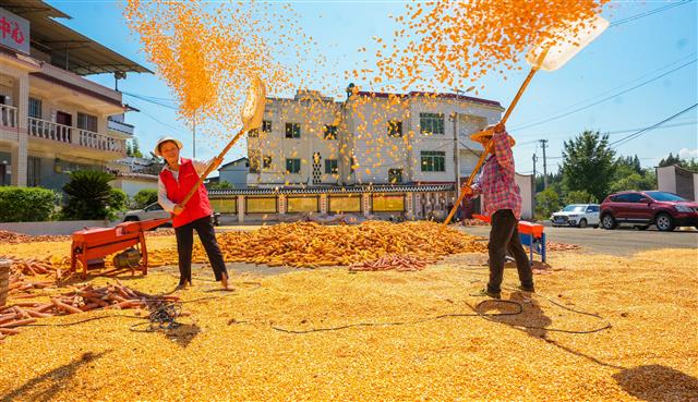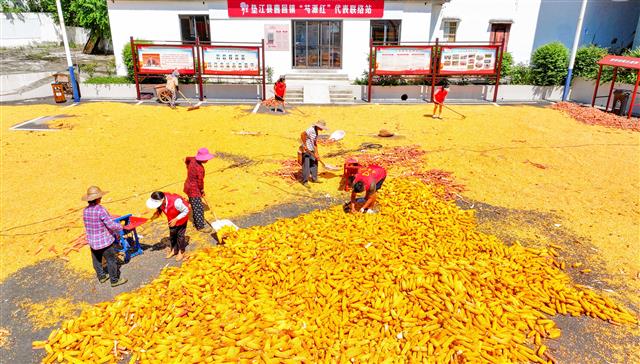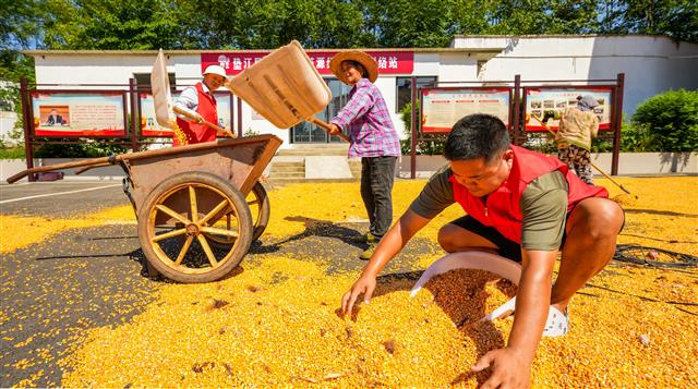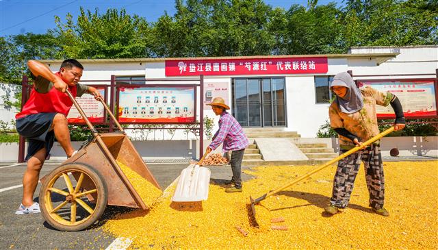 8月18日,曹回镇安山村人大代表联络站,志愿者帮助村民脱玉米粒、晾晒玉米。