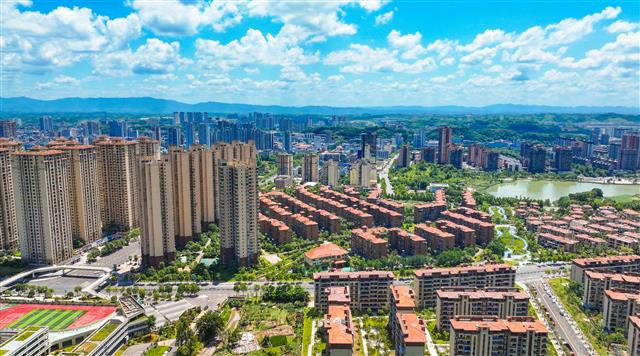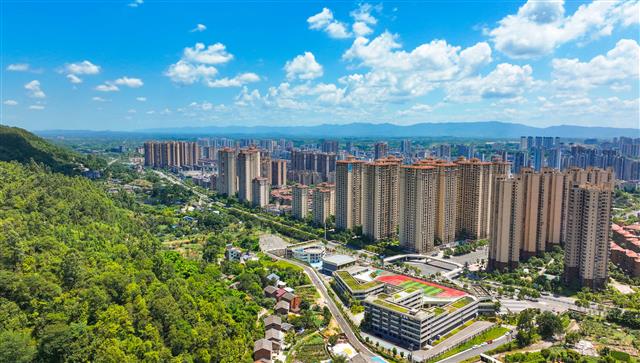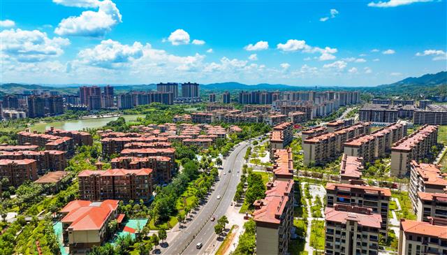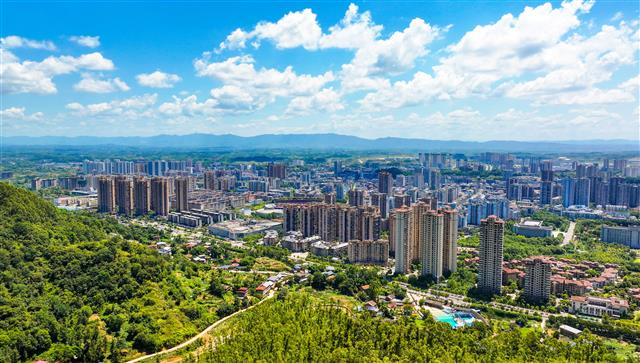 8月14日,县城区,蓝天白云下的城市绿意盎然,一派生机勃勃的景象。