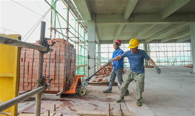 工人在转运砖头。