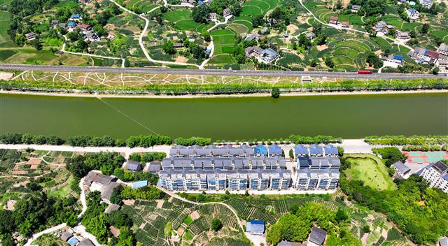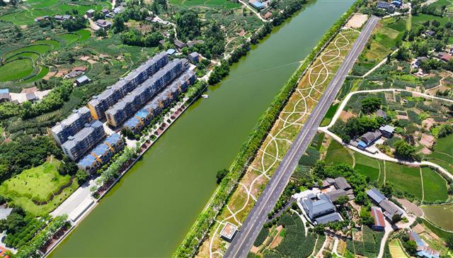 5月26日,龙溪河高安镇段,水清岸绿的河畔风光与民房相映成景。