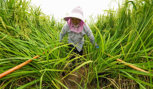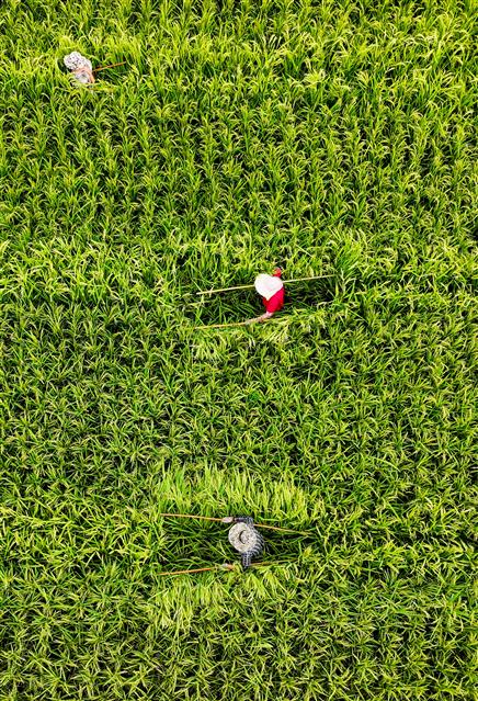 8月6日,沙坪镇李白村水稻制种基地里,工人为制种水稻进行“赶花”授粉,提高制种水稻的结实率和产量。