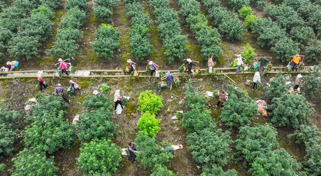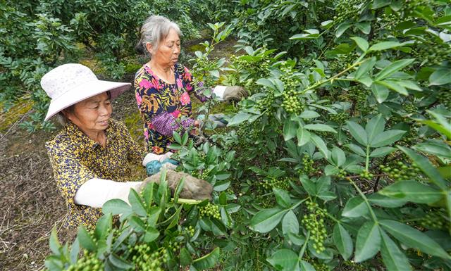 (花椒地里工人正在忙碌。)
