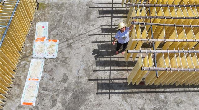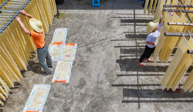 7月3日,长龙镇龙田村干面条生产基地里,工人利用连续晴好天气晾晒面条,确保市场的稳定供应。据了解,该基地通过采取“线上+线下”的经营模式,预计每月向全国各地销售干面条3吨以上。