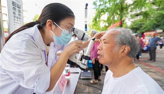 医生为老人检查眼睛。
