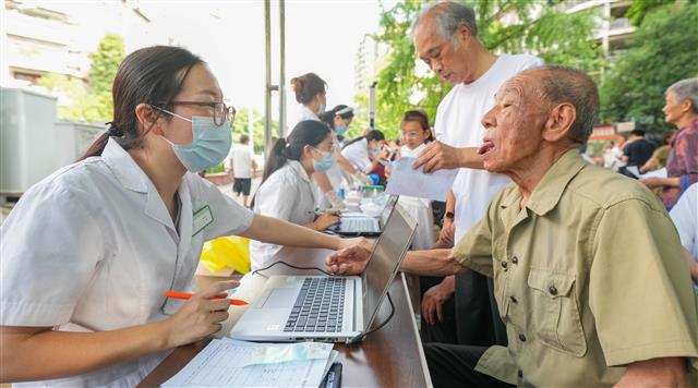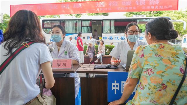 7月11日,在月阳广场,桂阳街道月阳社区组建的“专业社工志愿服务队”在为市民免费检查身体。