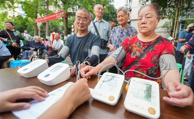 医生为老人测血压。