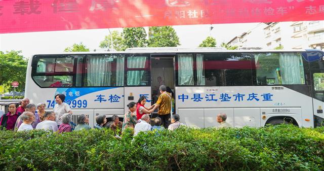 老人在“移送体检车”旁做检查。