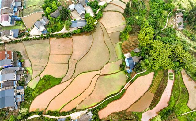 (梯田里村民在抓紧插秧。)
