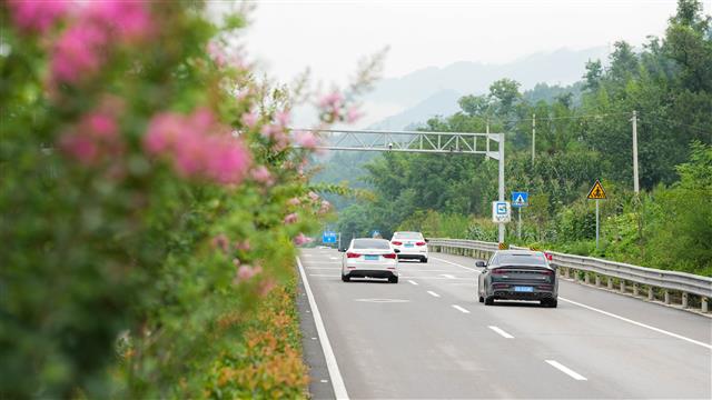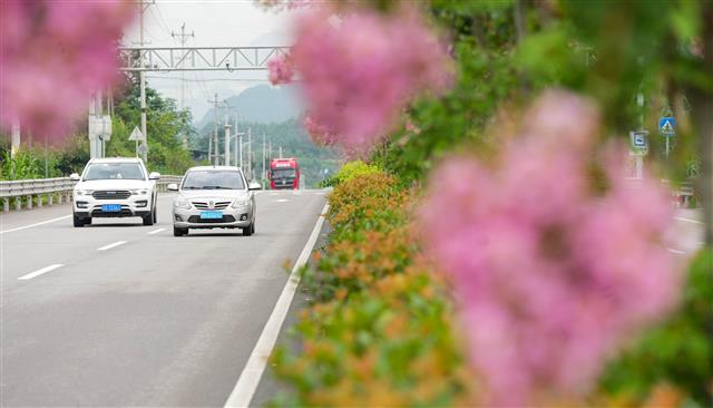 (紫薇花扮靓公路景色。)