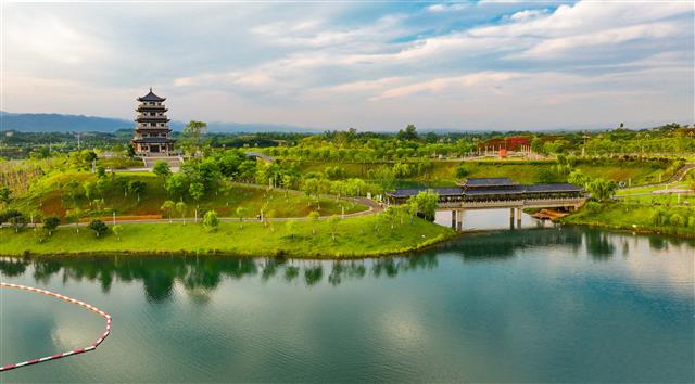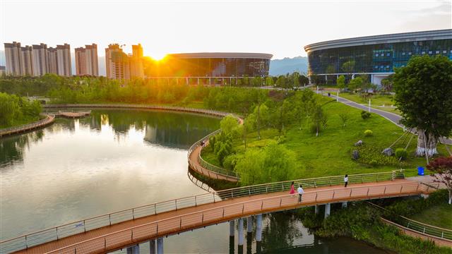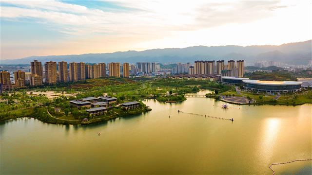 5月22日傍晚,三合湖湿地公园,落日余晖倾洒在波光粼粼的湖面上,呈现出水天一色的秀美画卷,市民漫步在公园里十分惬意。