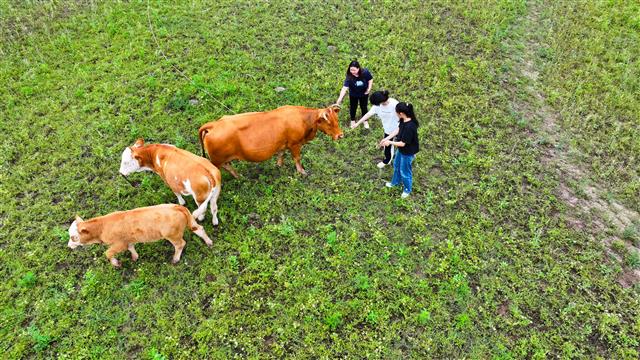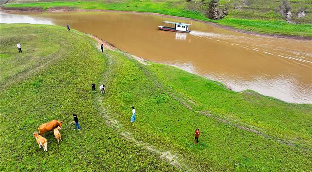 6月4日,三溪镇向前村长寿湖尾端,雨后的湖畔绿油油一片,吃草的牛群、游客和游船相映成趣。