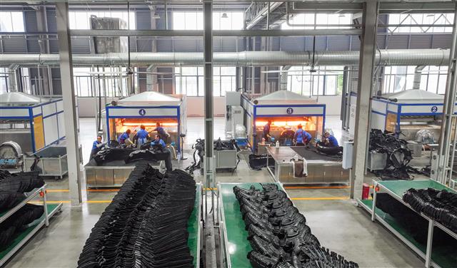 6月30日,垫江高新区博邦汽车零部件有限公司新建智能化工厂,工人正忙着加工汽车零部件产品。