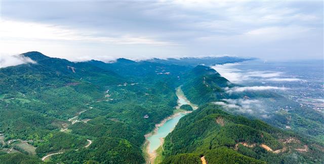 (云雾缭绕的明月山和城市。)