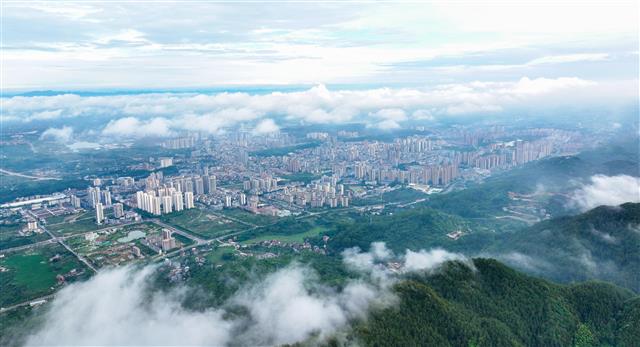 6月9日,垫江县城区,雨后的城市清新如画,和山间云雾相映成景。