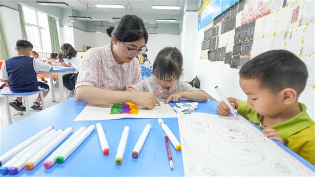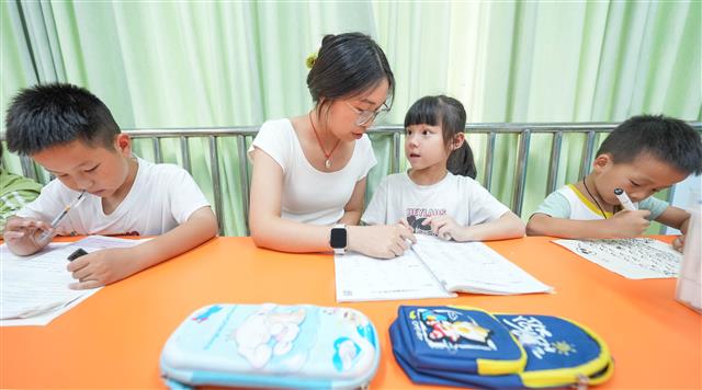 7月9日,少年宫公益托管班,志愿者老师在辅导学生做作业、画画和玩游戏。