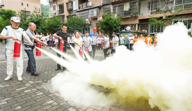 6月19日,在松林小区,县消防救援局、桂阳街道天宝社区、小区物业联合开展消防演练。
