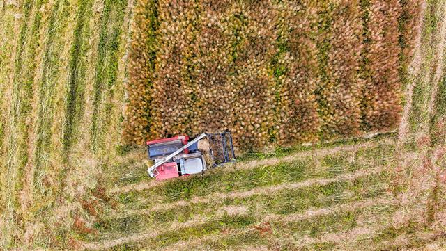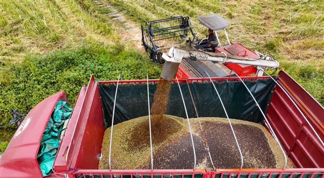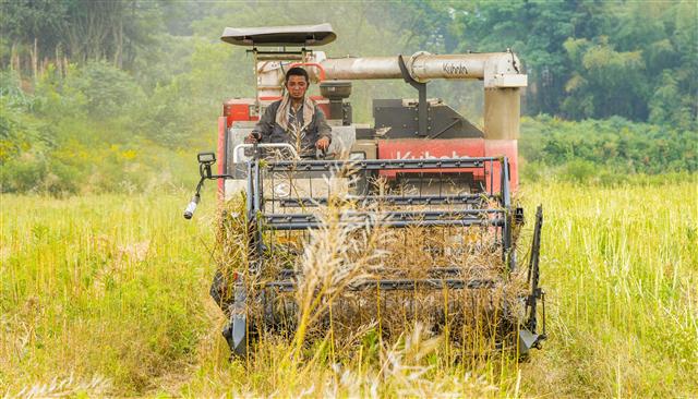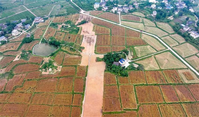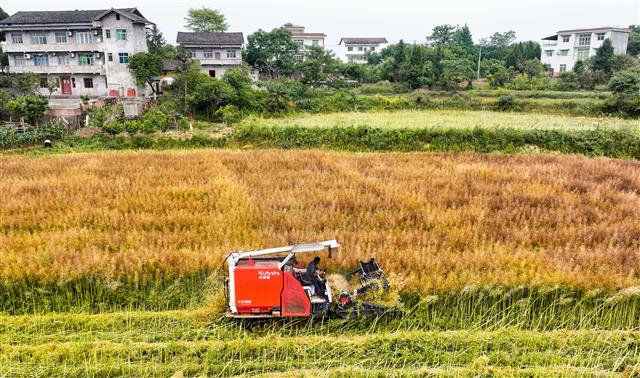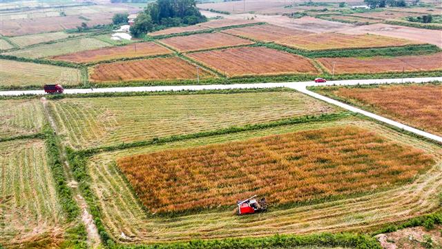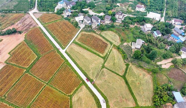 5月15日,高峰镇民主村高标准农田油菜进入收获期,农机穿梭田间忙收割。