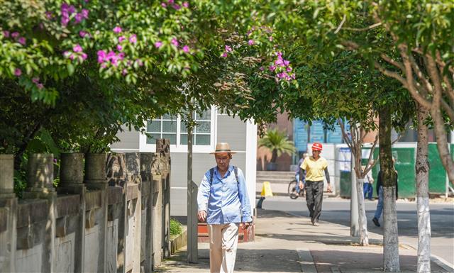 三角梅美丽宜人,市民在看景