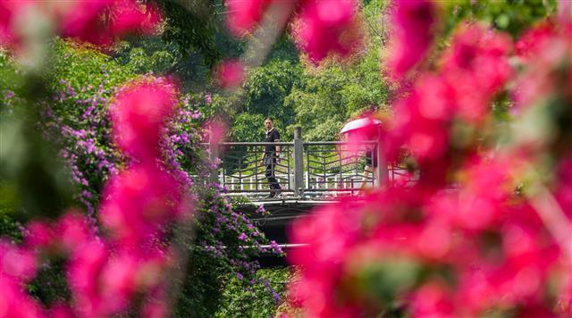 5月14日,桂溪河桂溪街道段,河岸的三角梅竞相绽放、美丽宜人,扮靓了城市景色。