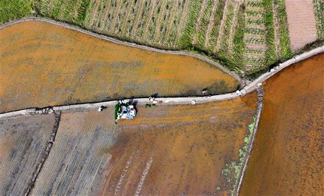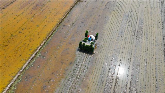 5月19日,沙坪镇李白村高标准农田,村民驾驶农机趁着晴好天气在稻田插秧。 农机插秧不仅效率高,而且秧苗行距、间距更均匀,更利于秧苗的生长。