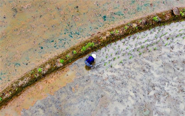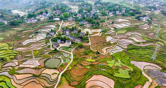 4月22日,高峰镇太山村,层层叠叠的梯田、错落有致的民房和稻田间插秧的村民共同绘就出一幅美丽的田园画卷。