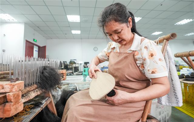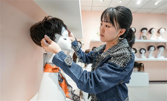 (工人查看假发佩戴效果。)