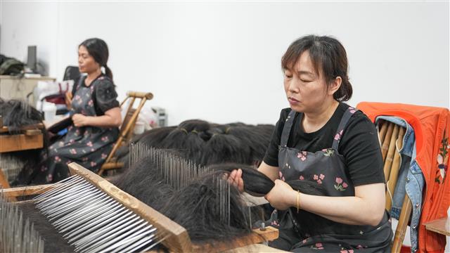 5月6日,垫江高新区贝丝特再生资源(重庆)有限公司,工人在车间赶制一批出口到孟加拉的假发原料。