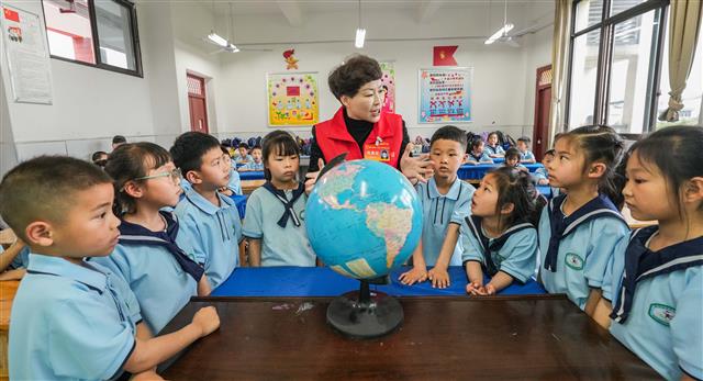 (学生和代表观察地球仪。)
