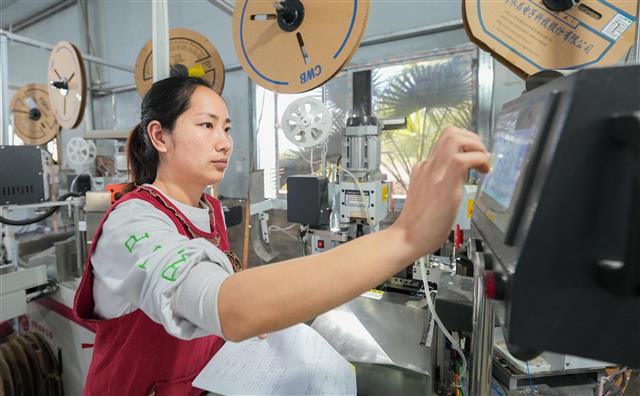 (工人在赶制电源线。)