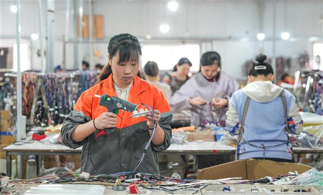 4月10日,长龙镇高桥社区“微企业”,工人在赶制一批家电电源线。